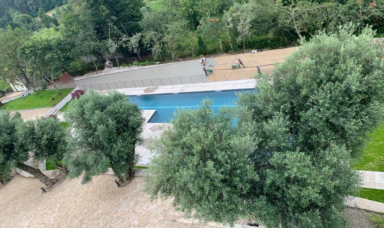 Aménagement autour de piscine avec pavage résistant et esthétique pour un cadre relaxant.